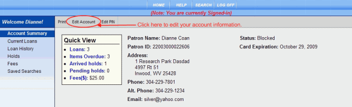 The Edit Account button on the Account Summary screen lets you make changes in your patron record regarding your address, phone number, alternate phone number, and email address. You are able to change any, or all of these fields in your patron account.