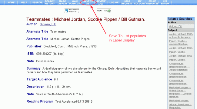 The Save To List populates on the PAC toolbar when you are viewing an individual item in the label display. The Save to List option provides a way to save individual items to a review list. The list you create is only viewable during your session on the PAC. The list is cleared when you become inactive in the PAC, Log Off the PAC, or choose to clear the list through the Review List option.