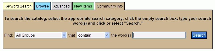 If this is an optional search in your PAC, you can select the Community Info tab and view a specialized search form. Community Info lets you search the library's database of information related to local issues, events, and other resources in your area.