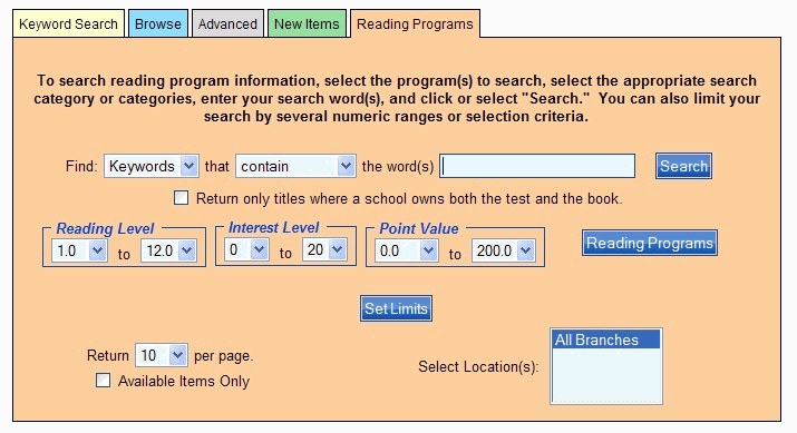 If this search option is available in your PAC, you can select the Reading Programs tab and display a specialized search form. You can limit by Reading Level, Interest Level, and Point Value, in addition to the standard search parameters. Consult your librarian if you are unfamiliar with the reading program parameters, or need information about the reading programs your library may be involved in.